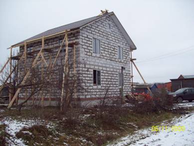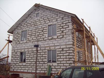 Здорово, Михалыч! Как будем делать фасад еще не решили. Размеры этого дома 9х9 и ушло около 70 кубов блока, не считая внутренние перегородки, они сделаны из кирпича.